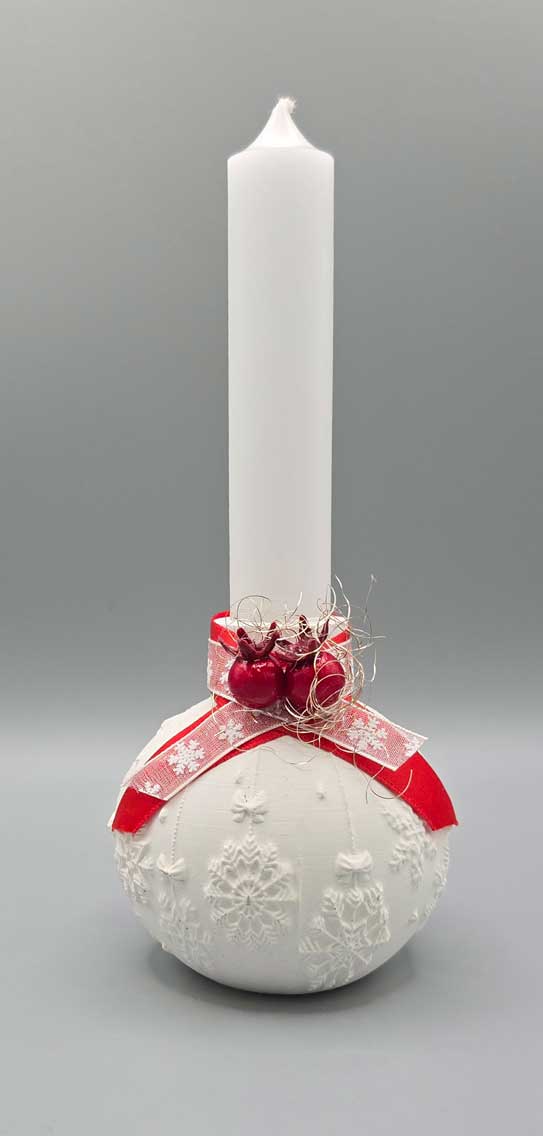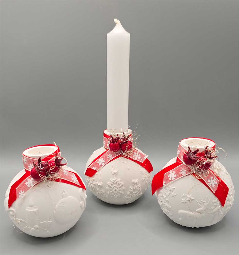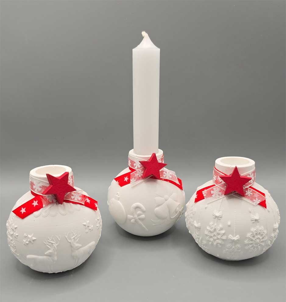 Deko - Set 3 weihnachtliche Kugel-Stabkerzenhalter aus keramischem Gießmaterial mit Stabkerzen